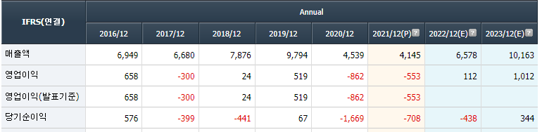 좀더 자세히 실적현황을 보자. 올해 예상 영업이익을 보면 예년 수준보다 훨씬 낮지만 일단 적자에서 흑자로 돌아설 것으로 전망되고 있다. 올해보다는 내년도 영업이익은 지난 7년중에서 가장 큰 폭의 실적 상승이 전망되고 있어, 리오프닝 관련주로서의 수혜가 단기테마로 끝나는 것이 아니라 장기 투자 종목으로서도 나쁘지 않음을 알수 있다.