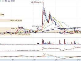 하락추세 끝자락에서 20일 이동평균선 지지받다가 장대 양봉 나오며 거래량 급증. 반등에 나섰다. 240일 중기 이평선까지는 최소 한차례 급등해 줄것으로 보인다.